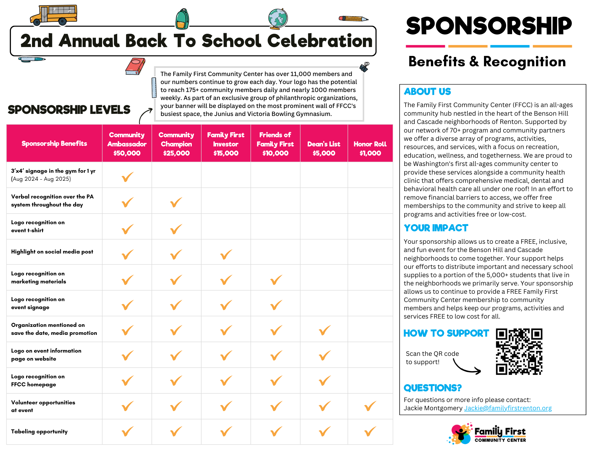 Your sponsorship allows us to create a FREE, inclusive, and fun event for the Benson Hill and Cascade neighborhoods to come together. Your support helps our efforts to distribute important and necessary school supplies to a portion of the 5,000+ students that live in the neighborhoods we primarily serve. Your sponsorship allows us to continue to provide a FREE Family First Community Center membership to community members and helps keep our programs, activities and services FREE to low cost for all.